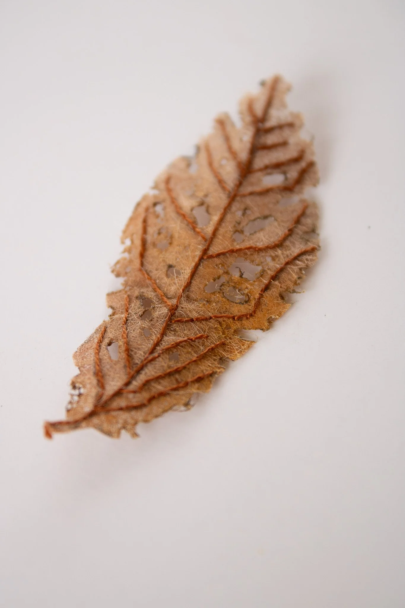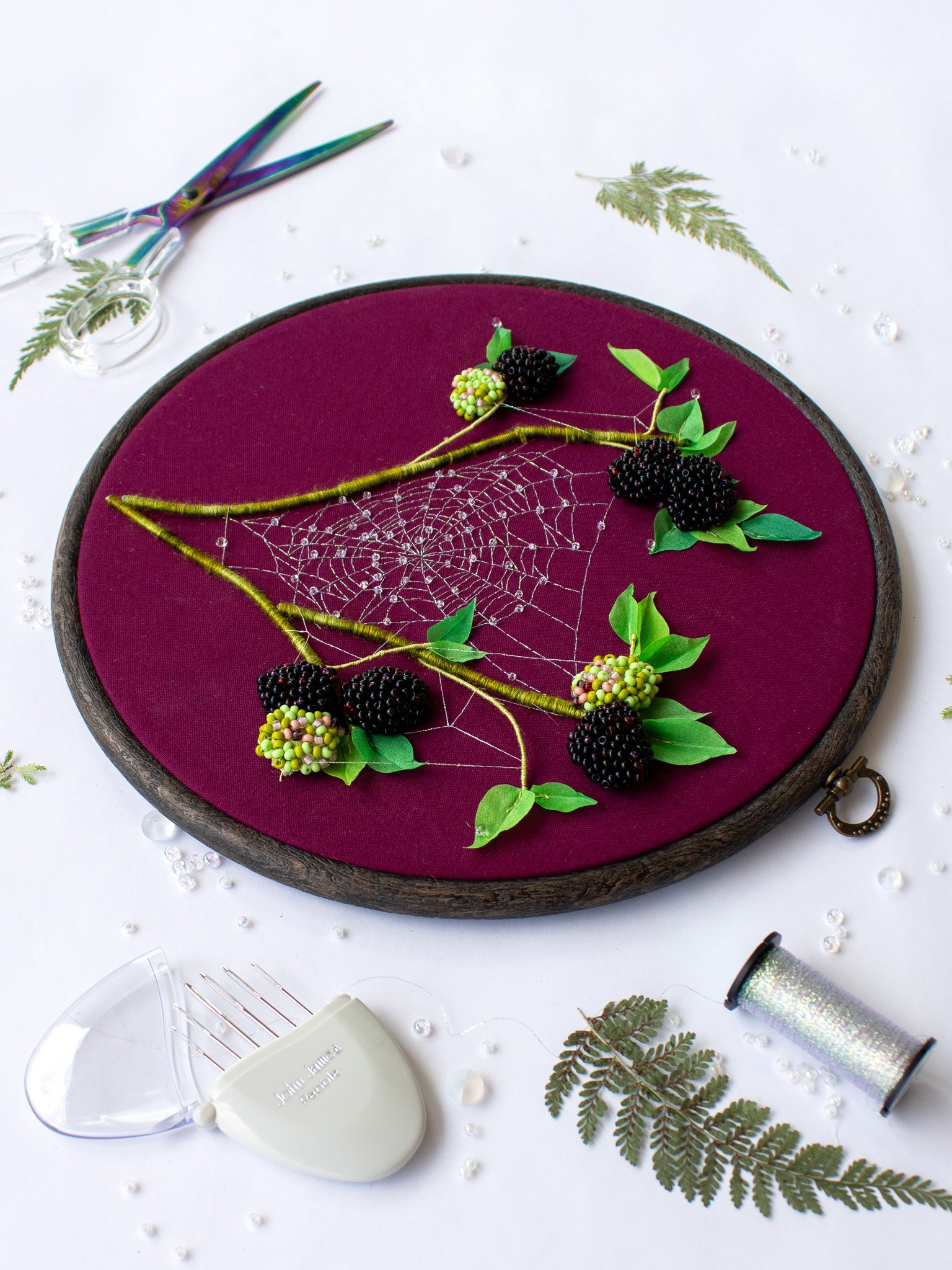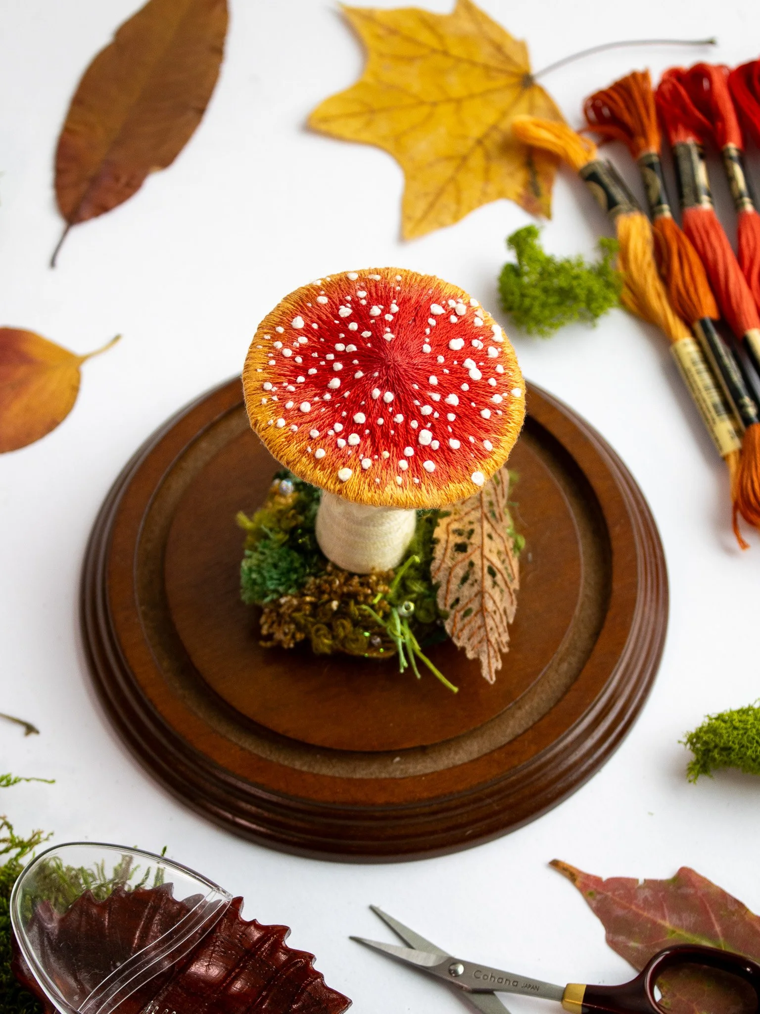 From there, we move onto the more complex three-dimensional pieces, such as the Praying Mantis, Hedgehog in a Blueberry Wreath, and two-sided Tree Frog. The hyper-realistic beaded slip technique in the Blackberry Bramble honestly had me floored, but the most fascinating and mind-boggling of all was definitely the Skeletal Leaf in last project.. the Amanita Mushroom! I still remember the day it was posted, briefly taking the internet by storm with claims that the leaf couldn’t possibly be embroidered. ..well, let me be the first to say- it definitely is, and you’re going to need to some hot tools for this one.