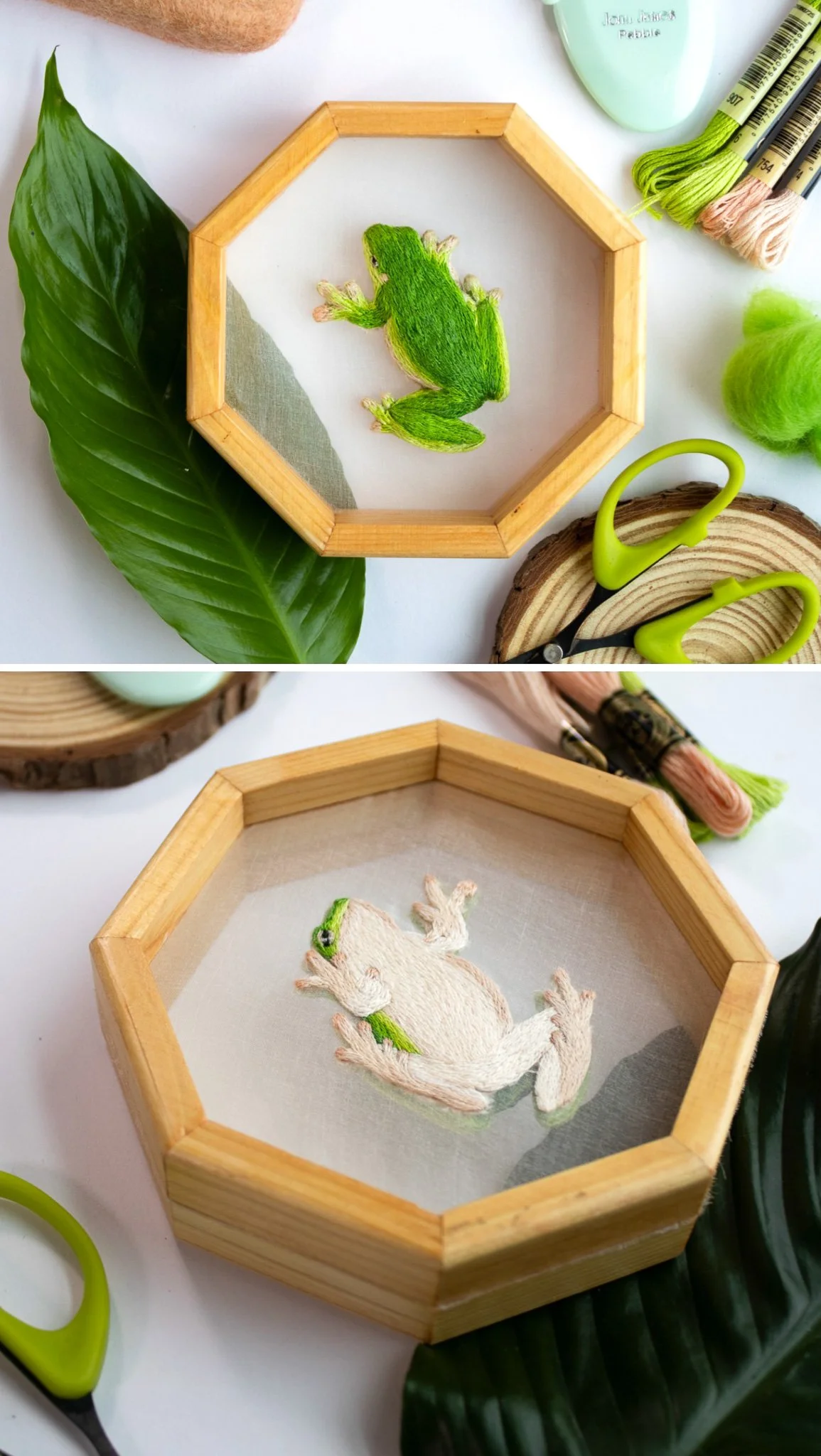 “When we lived along the Gulf coast, my family had a frequent visitor to our window each night: a small (and very loud) tree frog. This fascinating little creature brought us such immense joy with its vibrant coloring and exuberant croaking. I was inspired to stitch a two-sided replica where both sides of the design could be viewed.”